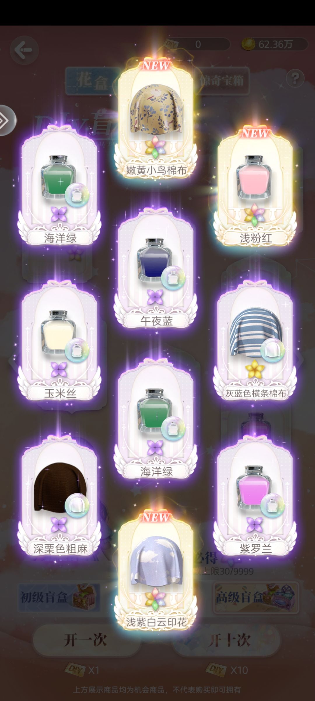 游戏更新后,增加了很多布料,需要开盲盒。出新率是有保底的,所以也不太看欧气。目前大部分人都是80~100抽毕业,我是94个盒子毕业。