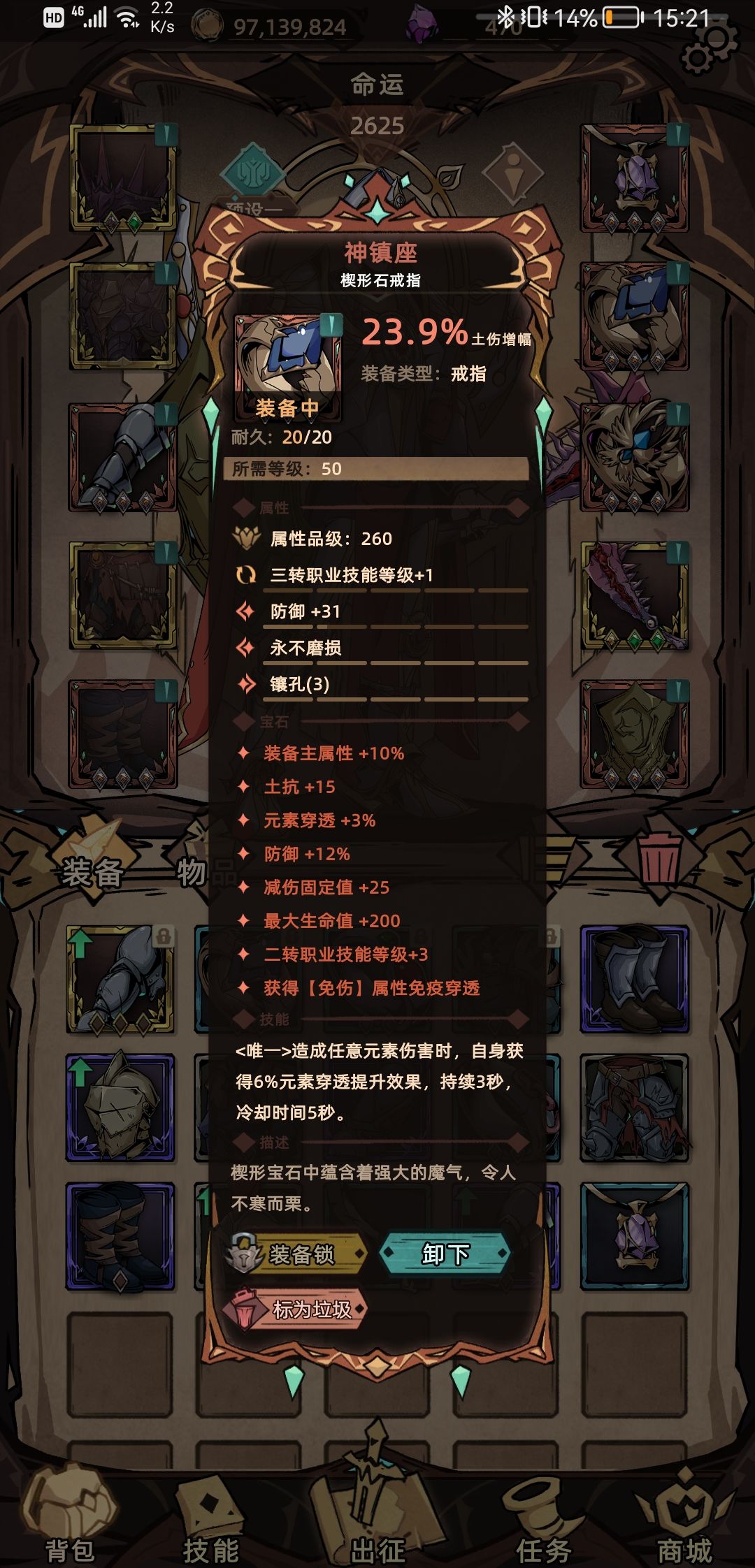 小tip:核心技能都在二转,所以双戒指做出来就能把技能加满,护腕2鞋子2头盔5戒指两个3正好15