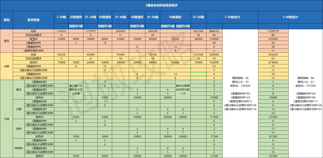 不多废话,下面是5星&4星各个阶段角色&光锥&行迹所需要的所有资源汇总,包含经验,材料,以及信用点