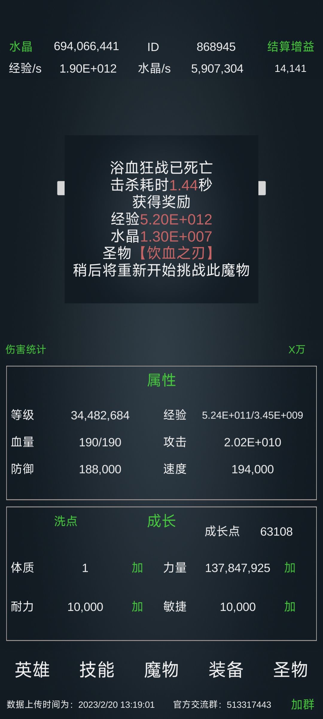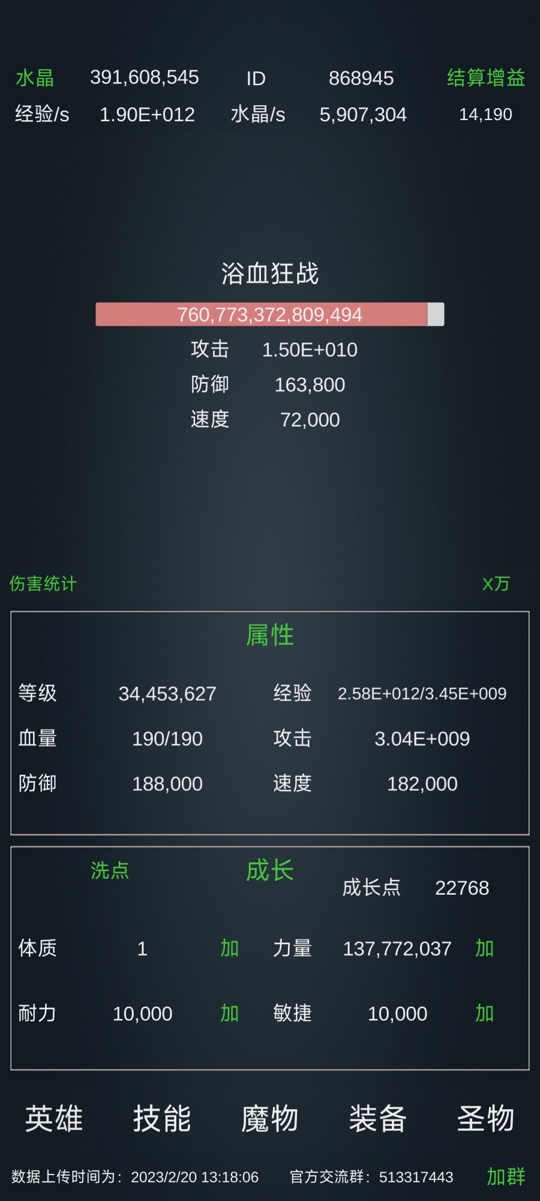 1亿耐敏训练,属性点点血量,千万元素盾,百万圣锁,5万弱点,手里剑,影子,观察百万,圣物凝液有12万,6万幽灵,10万龟壳,1万冰霜。用群里第一个文件,也就是0.1版本,可以赌过