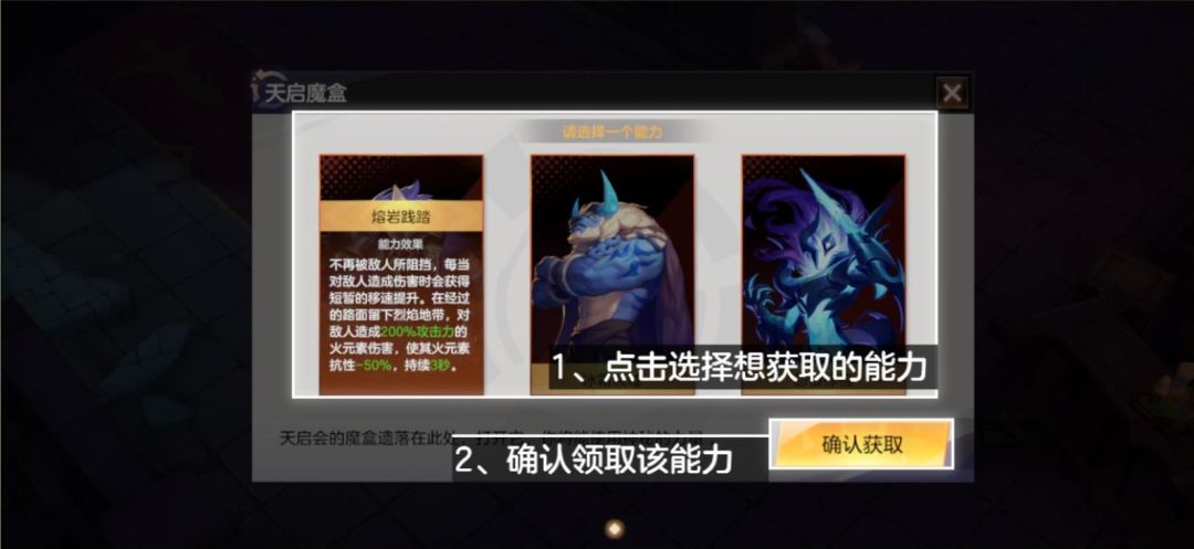 七、天启魔盒:冒险者需要寻找遗失在此地的天启魔盒,开启后可以选择并领取其中一种神秘力量,帮助我们快速通关!