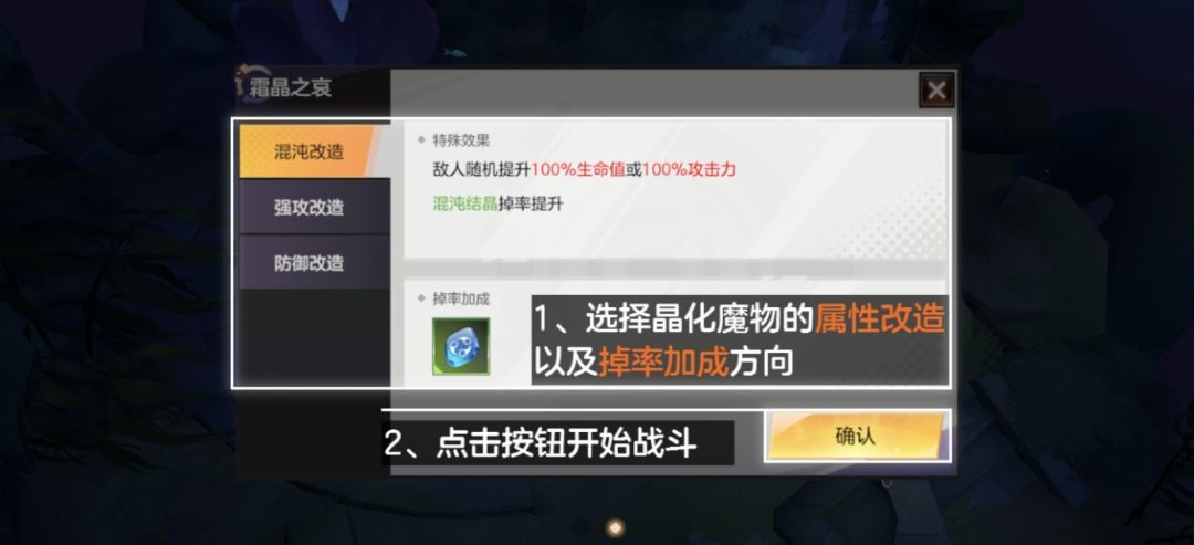 九、霜晶之哀:冒险者需要唤醒并打败晶化的魔怪,获得随机结晶奖励。在战斗开始之前,冒险者可以选择晶化魔物的属性改造以及掉率加成方向,提升目标结晶的掉落数,帮助我们打造更好的装备!