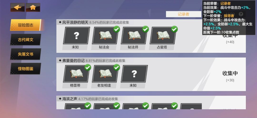 在讨伐过程中,冒险者会随机遇到冒险图志、古代碑文、失落文书等收集物,与之交互将记录在典藏中。此外,击败不同的敌人能够完善怪物图鉴。收集这些内容,冒险者们可以积累收集点数,并获得荣誉效果哦!