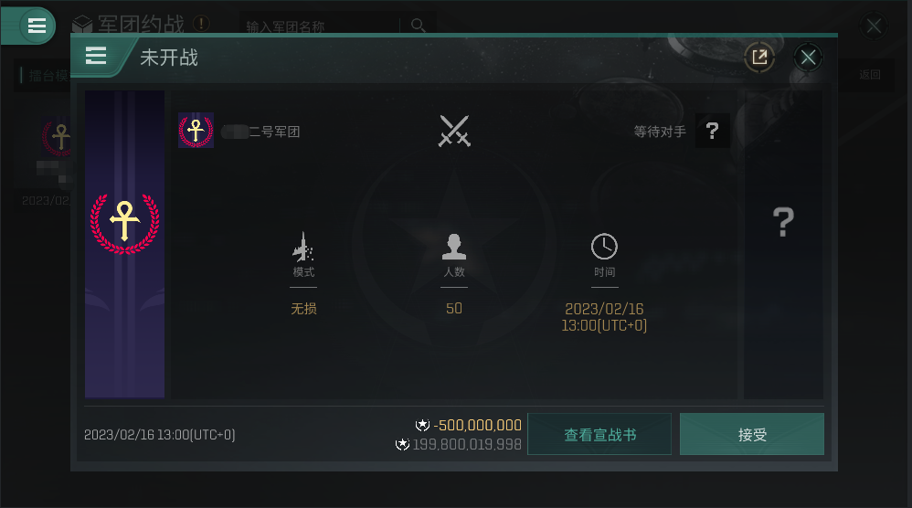 成功发起约战后,对方军团就会在我的军团-当前约战-约战申请中收到约战邀请。(若是擂台模式,则所有军团均可在我的军团-寻找对手中查看,但只有第一个操作的军团才能接受成功)