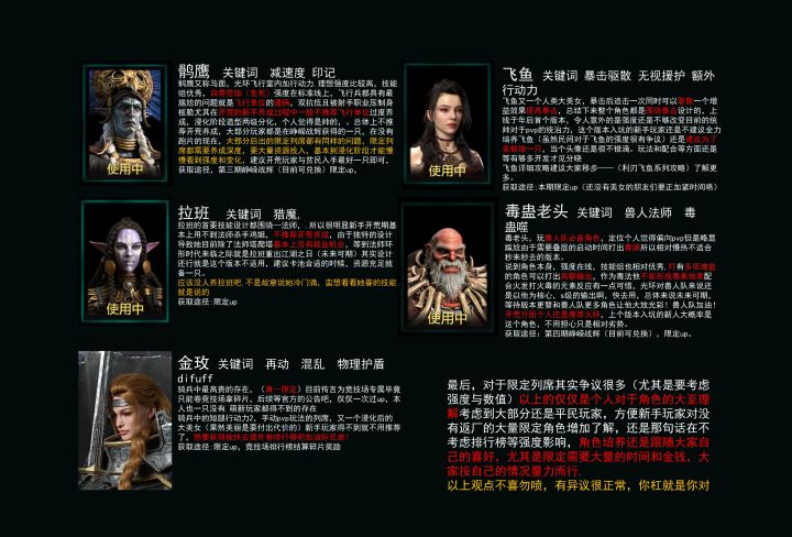 图片内容均为个人游戏总结,介绍了目前公测后已上线的限定列席供给新手玩家入坑了解,在尽量不涉及数值强度方面对列席角色就行介绍,个人制作希望新入坑的朋友们在抽限定列席时可以更加理性抽取