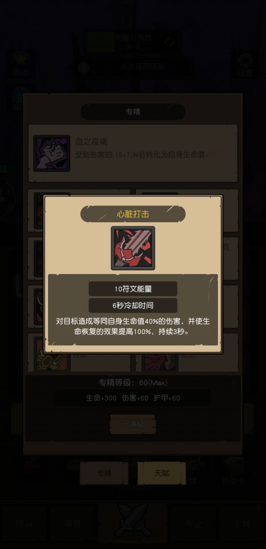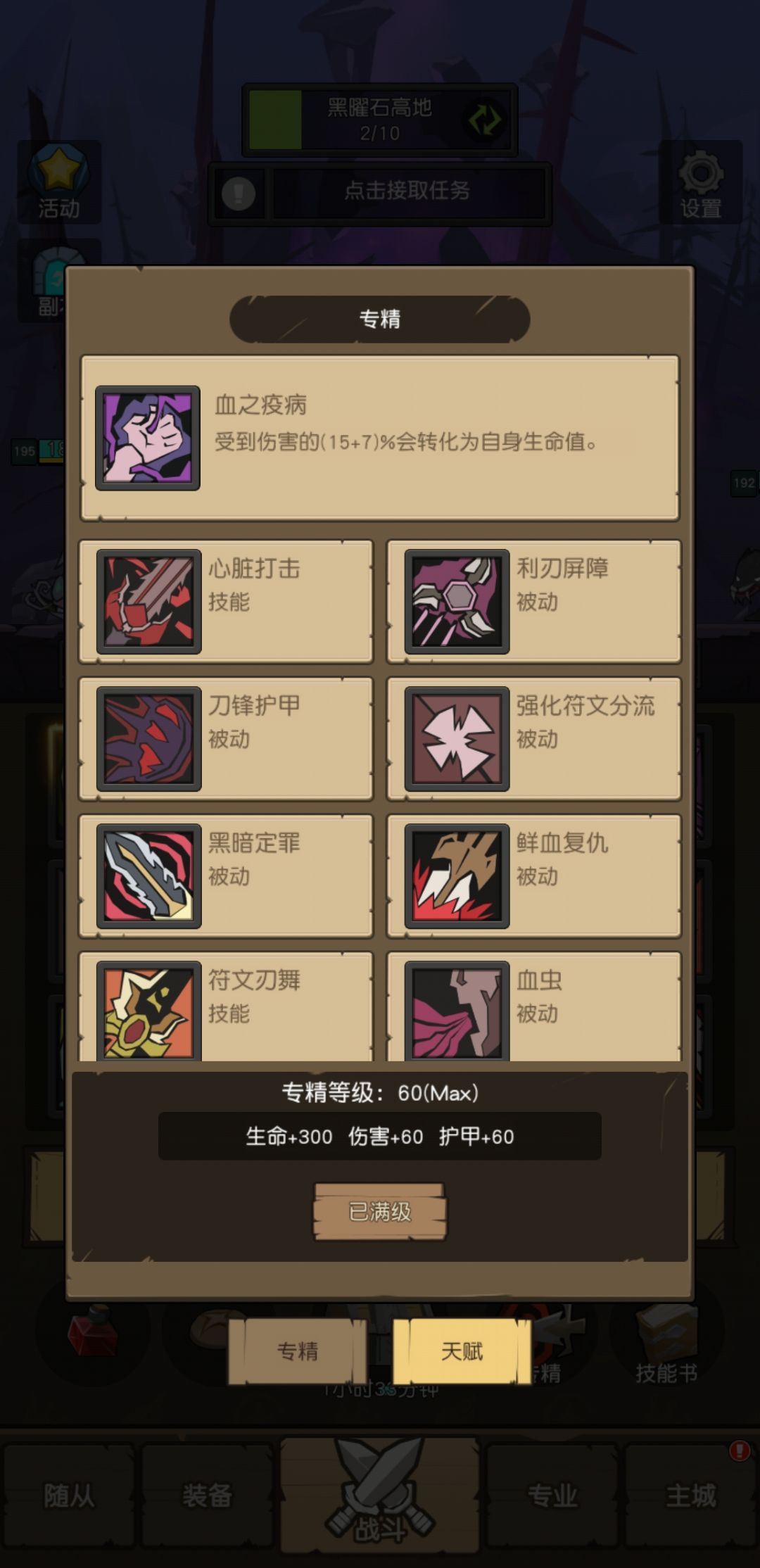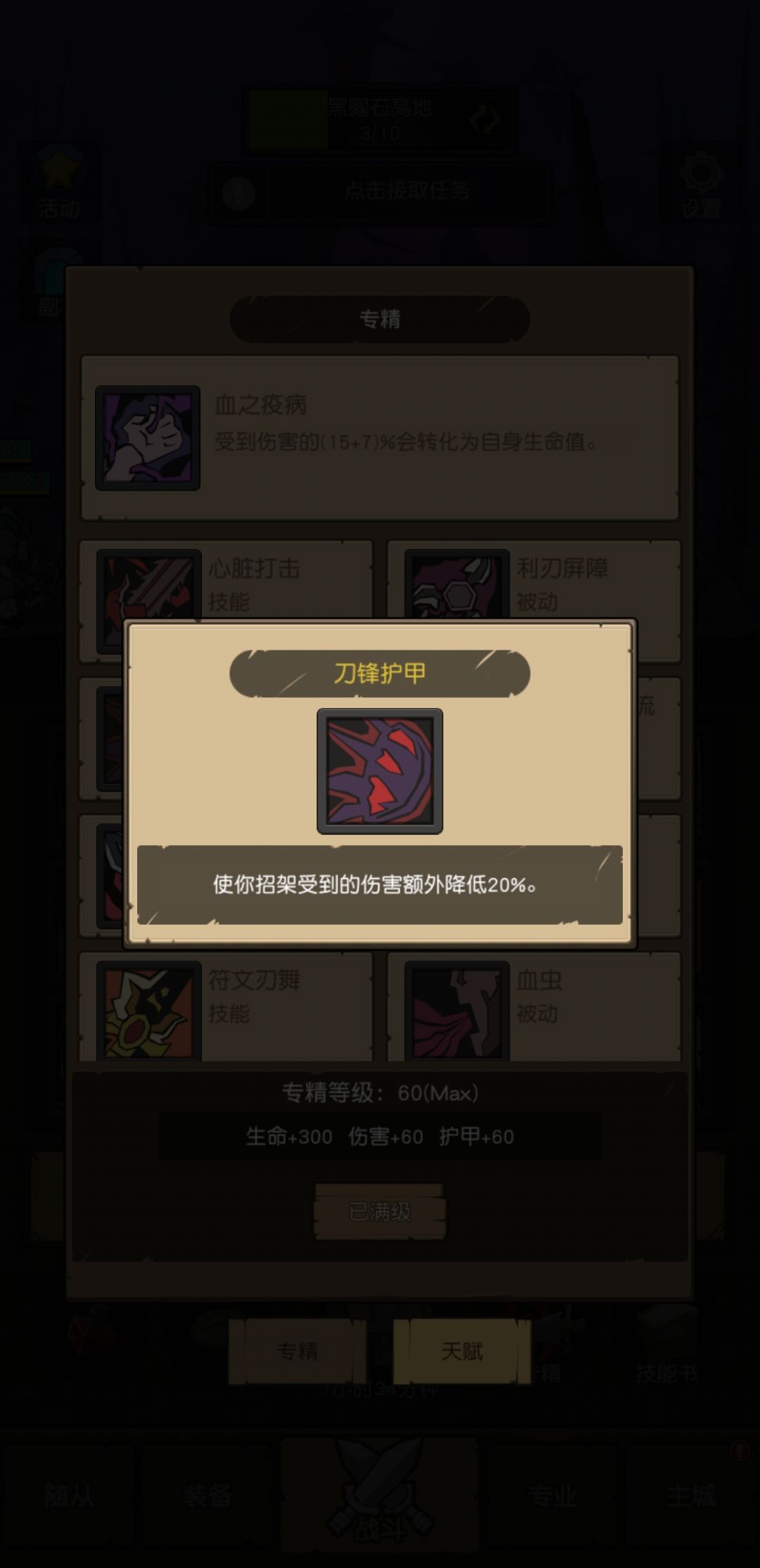 专精方面,鲜血专精主要体现在能抗能打,而这具体表现在以下几个方面的专精技能:首先是鲜血的精通,可以根据受到的伤害回复一定的血量。
