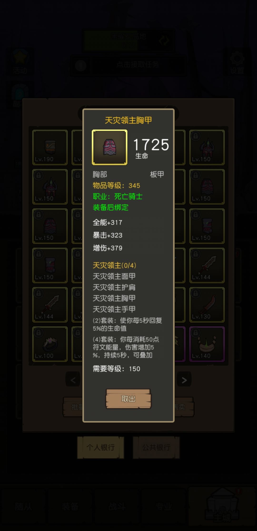 此阶段的boss伤害尽管很高,但是在你有成型的150套装的加持下,这些伤害都不是问题,唯一困扰你的可能是自己的伤害有一些低。鲜血专精提升伤害的办法不多,除了通过专精、宝石、强化提升外,目前版本可通过带一把兄弟会之剑(两把也可以)、一把末日之斧来提升效率。装备方面,可通过多次打本积累一定装备后再根据属性更换190套装。
