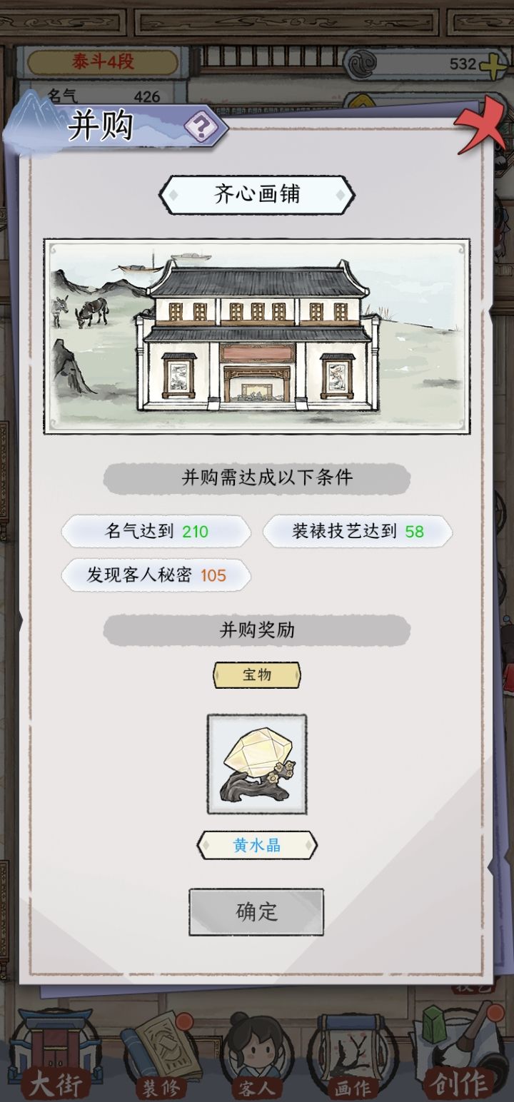 建议可以稍微出个过场动画,并购的意思是公司吞并,那我们的画铺就是在做大做强,可以出个剪彩仪式什么的。