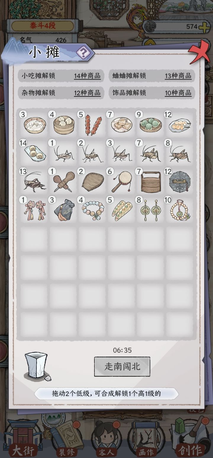 小摊这个模块的走南闯北按钮感觉过于简单,好像就随便走走。初步想法是添加东北,东南,西北,西南,中间是中部地区,小摊的食物可以取各地区前三就可以了。比如东北有烤串什么的。