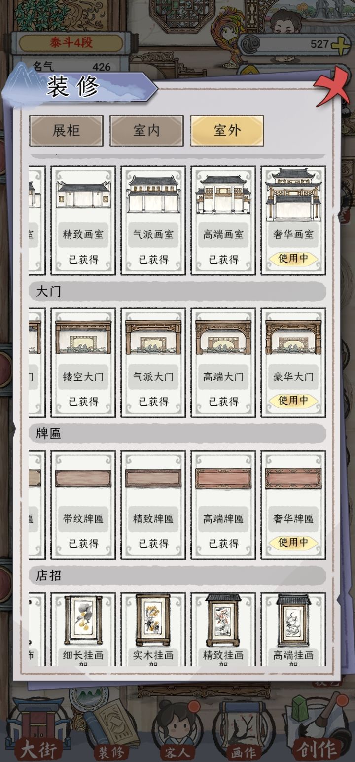 第四个:名气获取这里,是根据室内室外的装修来递增的。感觉把卖出去画的数量等等也算在提高名气的方法之一,也就是段位。