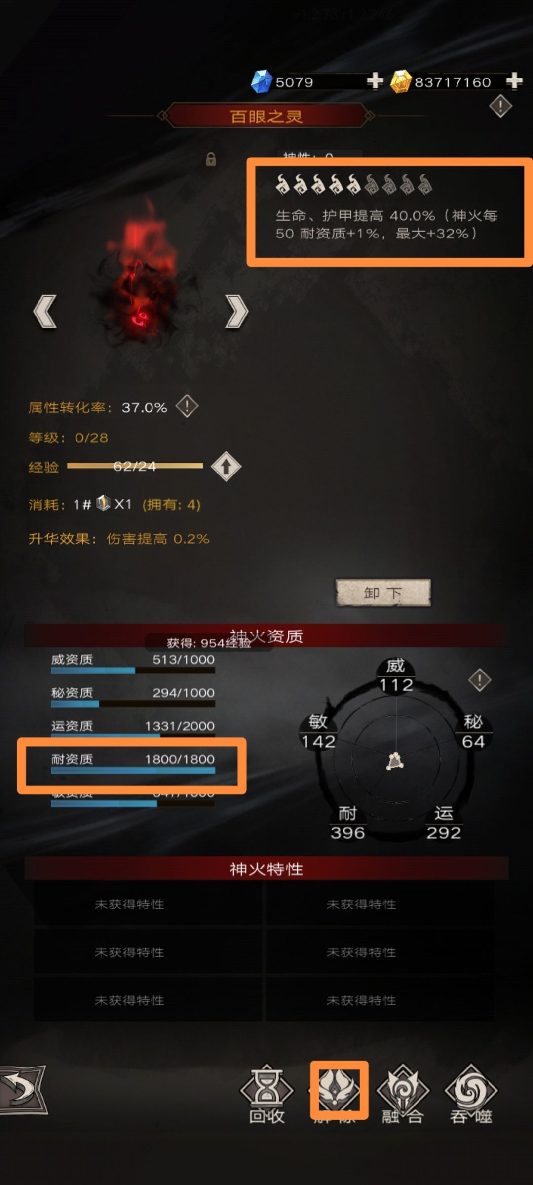 这套BD的思路就是血皮越厚,伤害越高,因此满耐资质的百眼之灵,就是这套BD第二阶段的毕业神火。