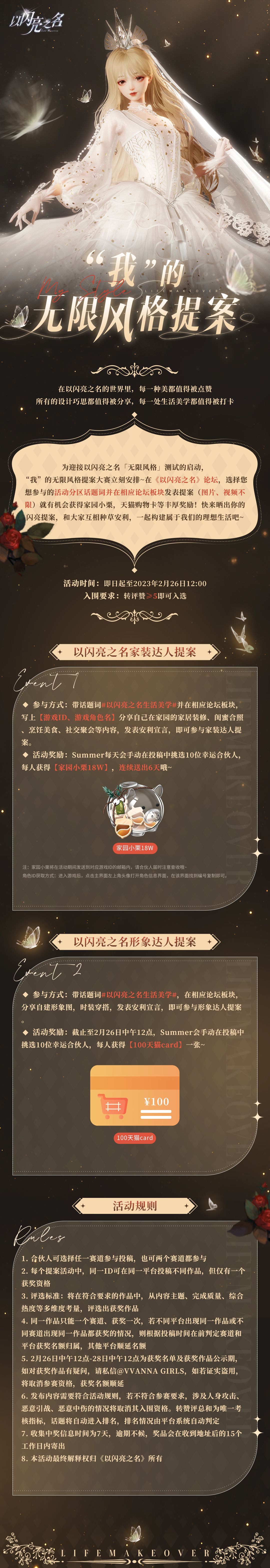 亲爱的合伙人们,为迎接《以闪亮之名》「无限风格」测试的启动,“我”的无限风格提案大赛立刻安排~在《以闪亮之名》论坛,选择您想参与的活动分区话题词发表提案(图片、视频不限),分享你的生活美学或颜究美学,就有机会获得家园小栗,百元购物卡等丰厚奖励!快来晒出你的闪亮提案,和大家互相种草安利,一起构建属于我们的理想生活吧~