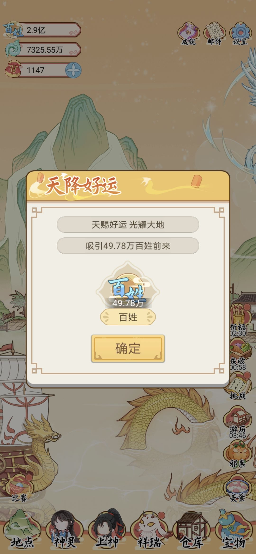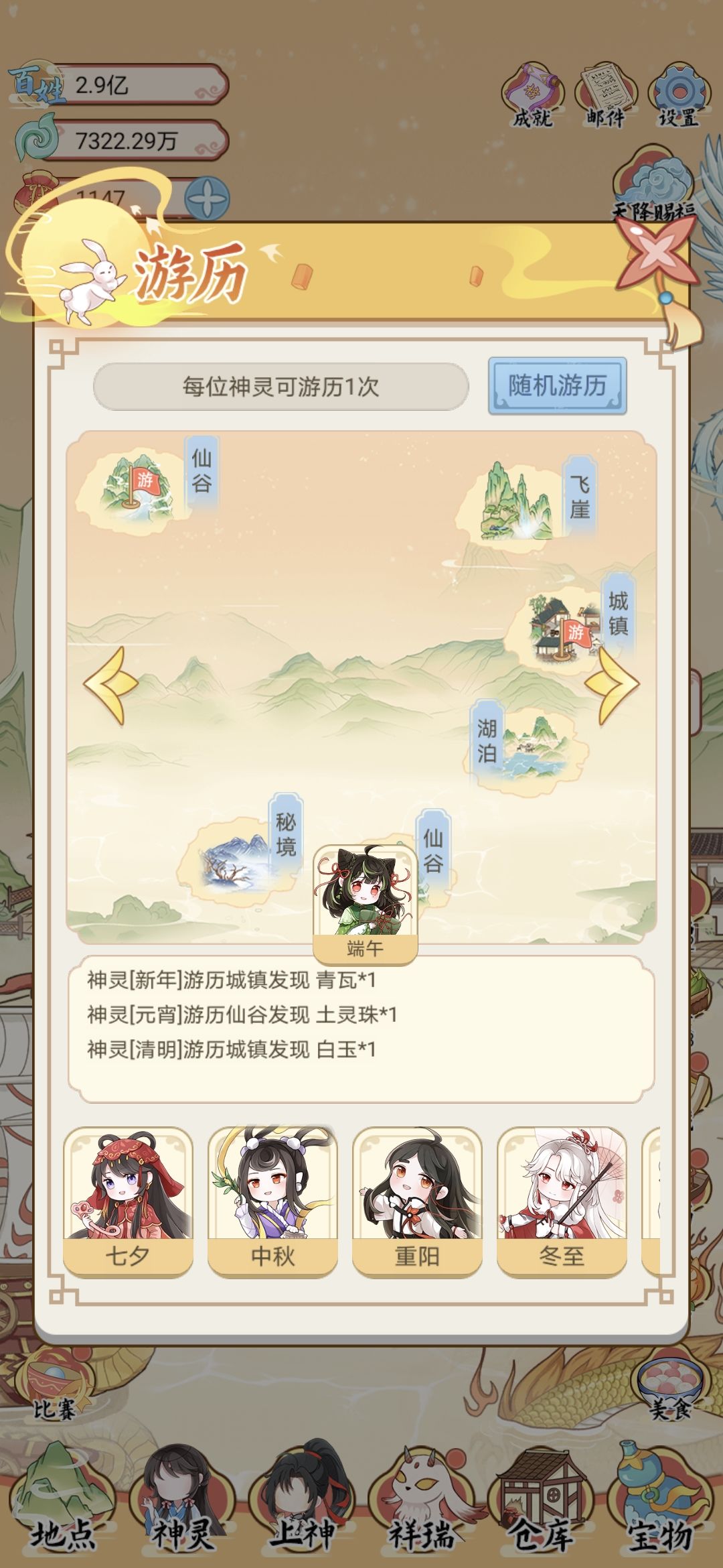 4、最重要的游历,不需要多长时间神灵数量就满了和游历地点数量一致,所以直接随机游历就好