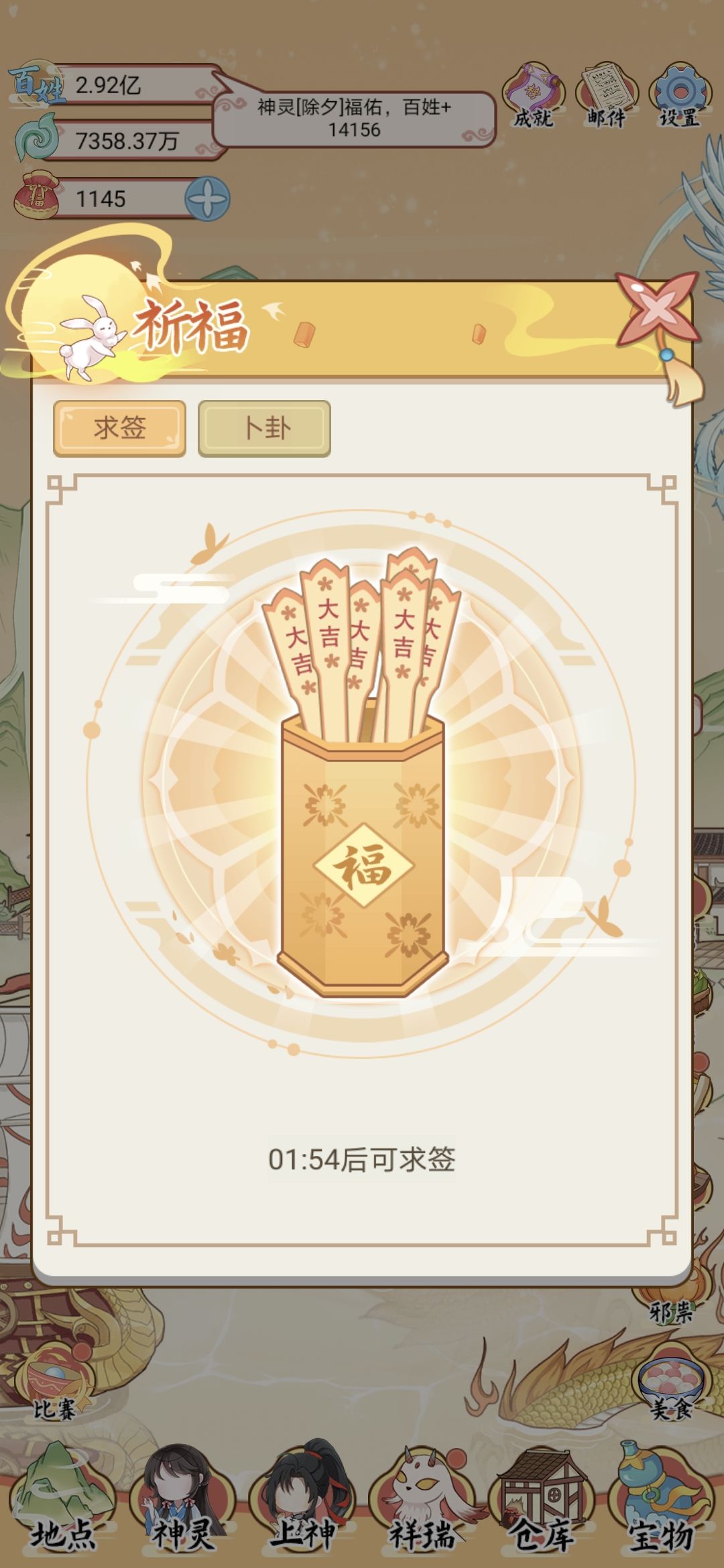 2、求签随机性很大,唯一需要的是求签的上上卦(直接给宝物)