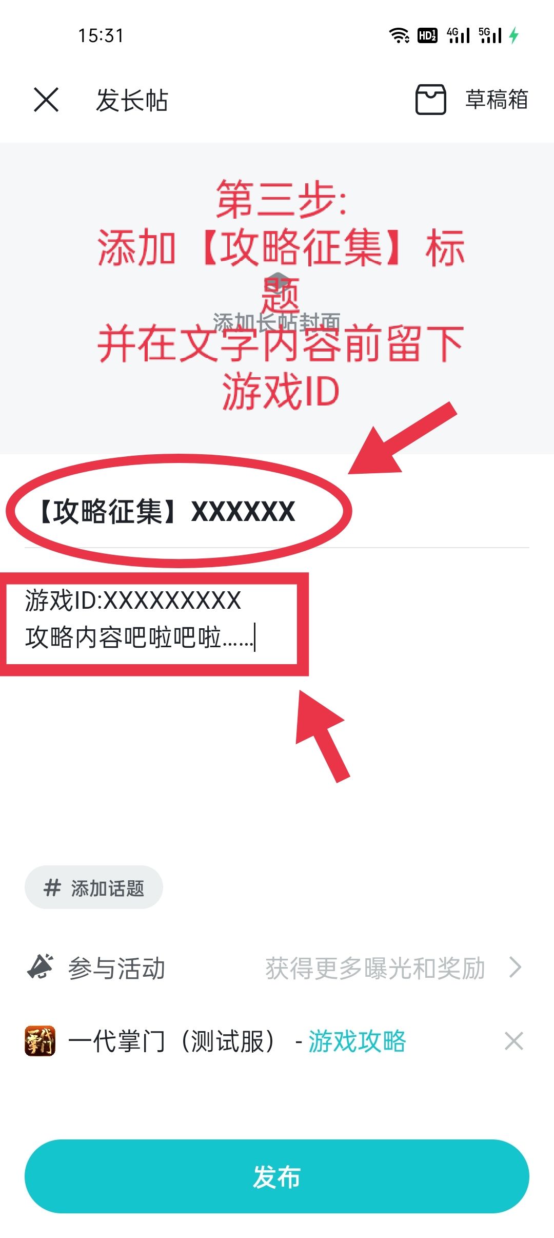 3.选择【游戏攻略】子版块并编写标题与正文,并且必须在“正文内容”内留下你的游戏ID,否则将无法发放奖励(这一步很关键哦~)