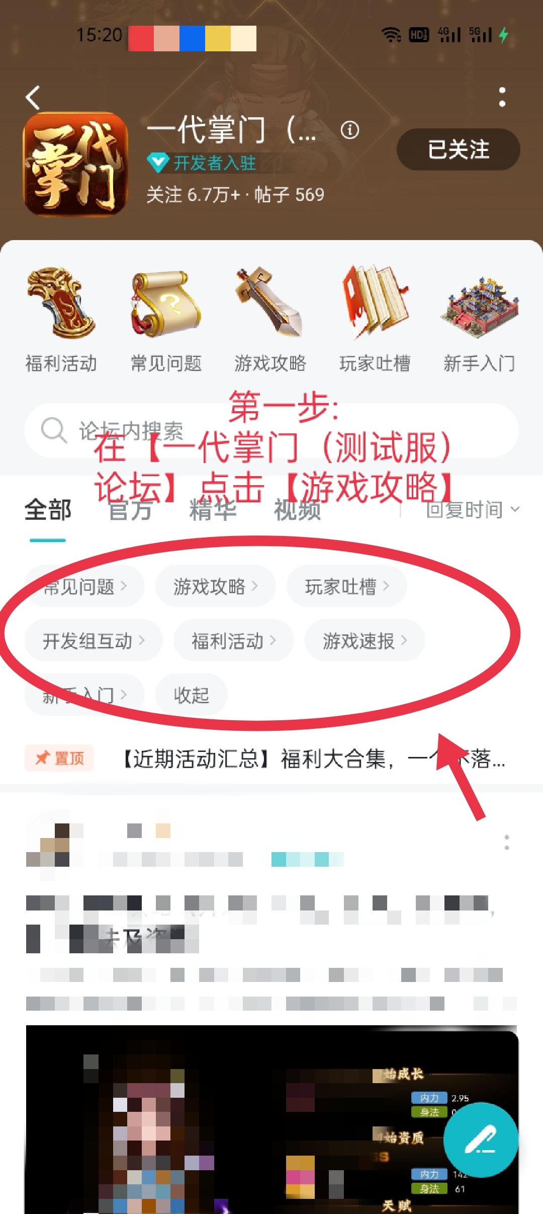 1.进入【一代掌门(测试服)】社区进行发布内容,再点击【发长帖】子版块选择【游戏攻略】;