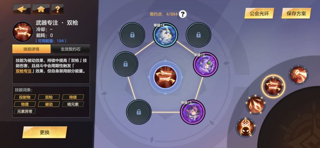 三技能比较重要,我之前花大价值更换了武器特效2触3,三技能选择爆裂射击,理论上叠加一个主输出技能伤害应该伤害会发生质变,但是经过测试得出,因为契约石,天赋更侧重于二技能,三技能由于吃到的加成不够多,甚至不如一条命中转爆伤武器特性,所以后面我放弃了,现在是双枪专注被动,带高阶暗元素石头加异增,可以减少敌人大量防御,蓝色石头减少耗能可以大幅度减少封印能量,