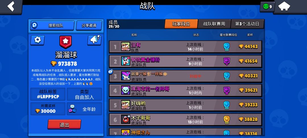总队招人要求:星光联赛钻3,杯数三万杯以上,拥有5个11级角色,活跃度要求比较高需要打战队赛