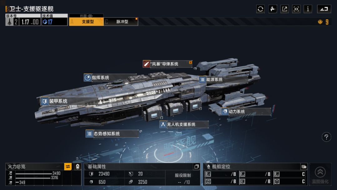 卫士支援型强大的生存能力,得益于其态势感知系统自带的“降低被导弹命中率”,以及该模块里可降低被制导武器命中率,再加上又是中排站位,在前排没有掉光的前提下,能打到中排的只有战机/护航艇以及曲射武器,高曲射武器闪避直接把生存能力拉高好几个层次。