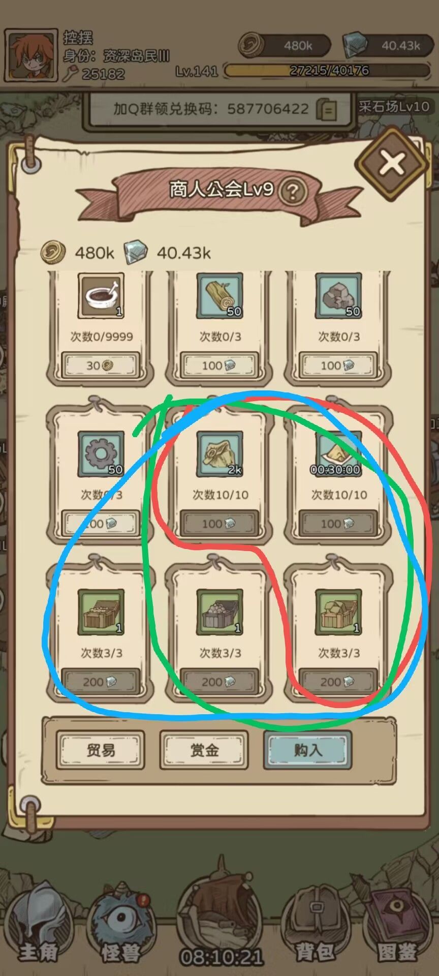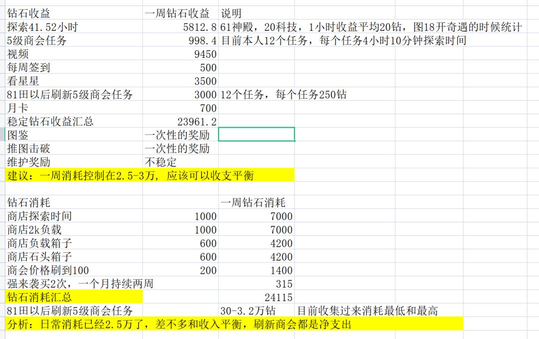 绿色圈:考虑到目前版本61营地后缺石头,所以买石头箱子,等到61石头场建成以后使用,一共3200钻/天。目前我是这样买