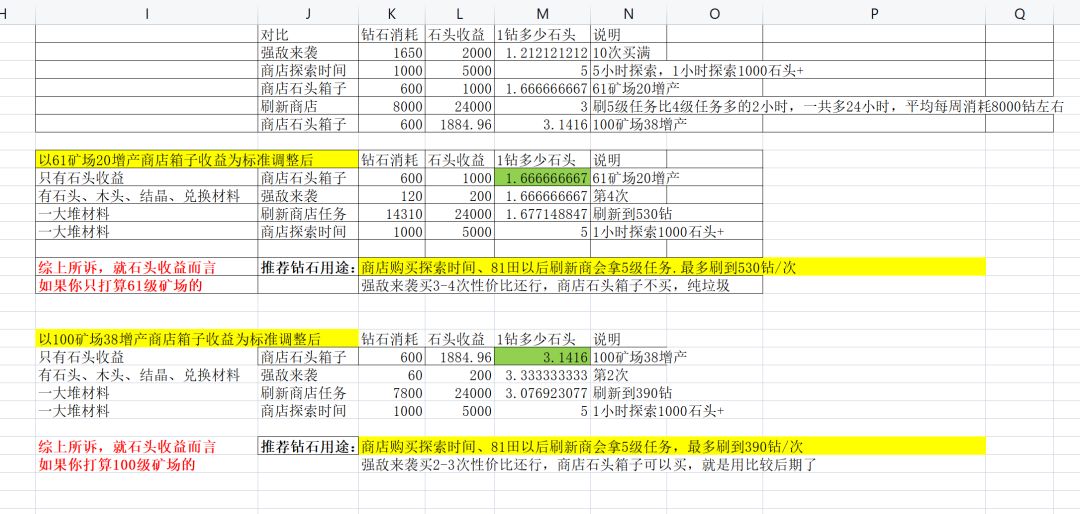 上图是以商店购买石头箱子配合中期61级采石场20 科技和后期100采石场和38级科技为标准,其他钻石消耗获取石头收益的对比。