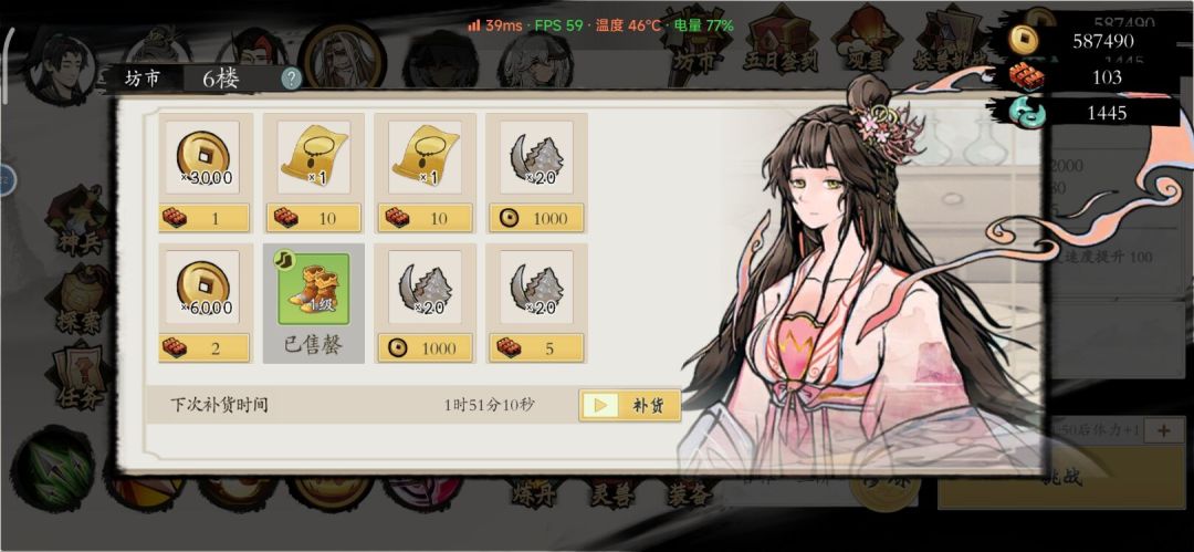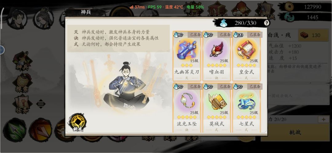 分为神兵探索、装备探索和铜币探索,神兵只能看广告才能活动,装备可以用抽奖卷来获取,抽奖卷主要来源是战斗(合体地图皆为绿四张,黄两张)铜币探索也是只能看广告,但前期收益比较高