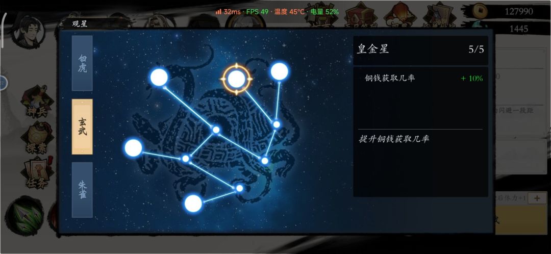 观星相当于天赋系统,白虎对应战斗,玄武对应功能,朱雀对应装备和修炼,这里推荐优先拉满玄武里的铜币获取概率,其他的可以慢慢拉起来