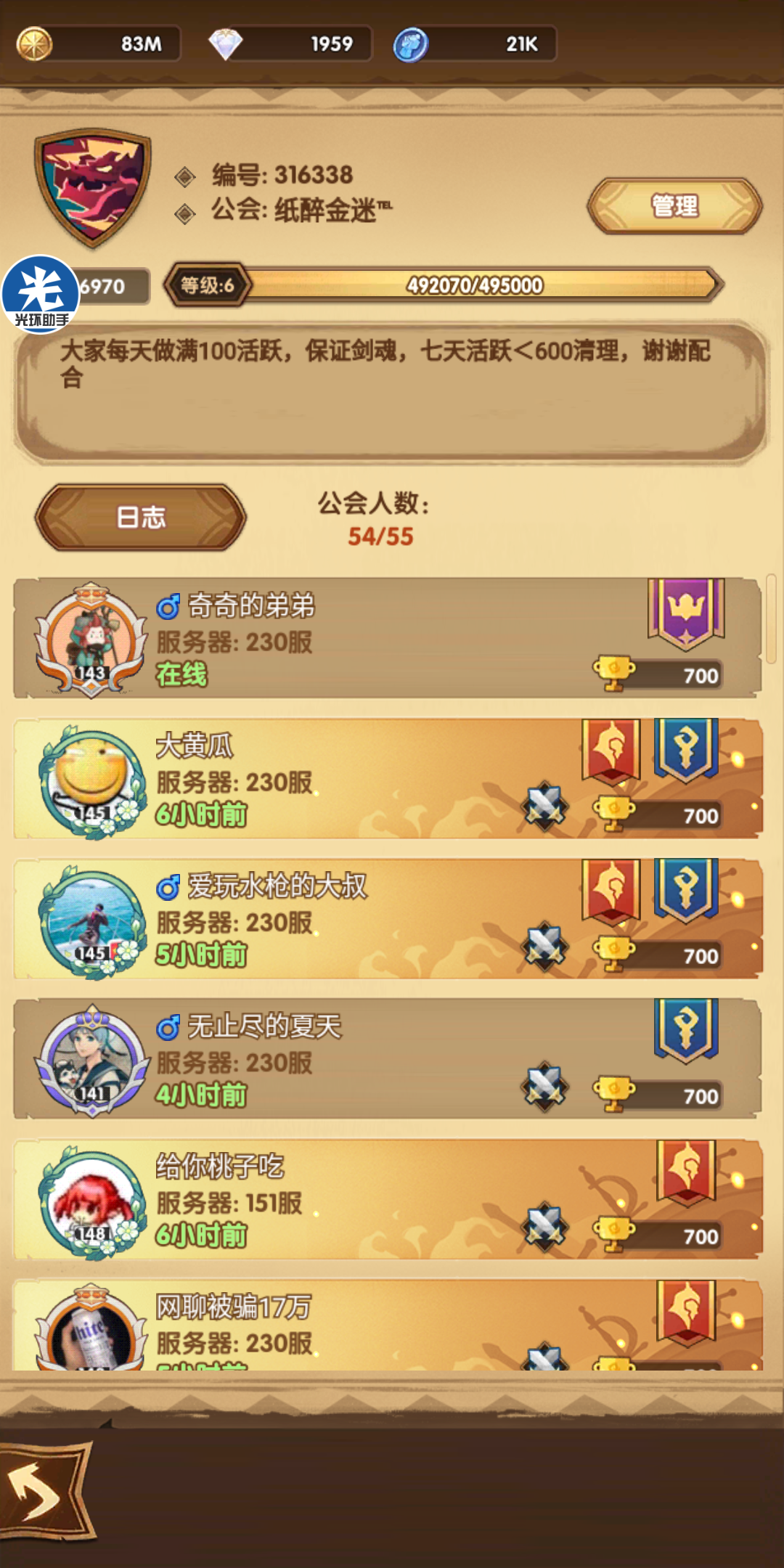 明天升七级工会,全员活跃,有稳定梦境奖励,有微信群,团本人均亲王,