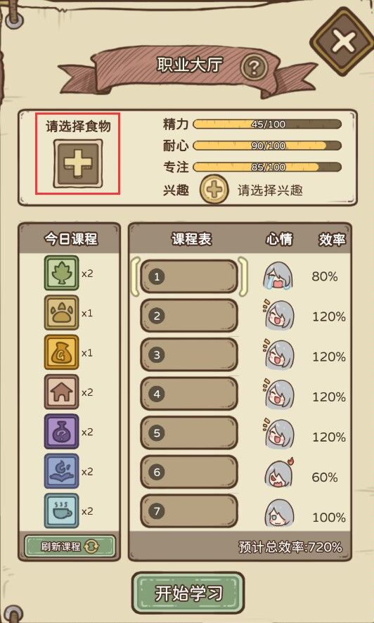 精力: 影响学习效率,数值越高效率越高(越高越好),每学