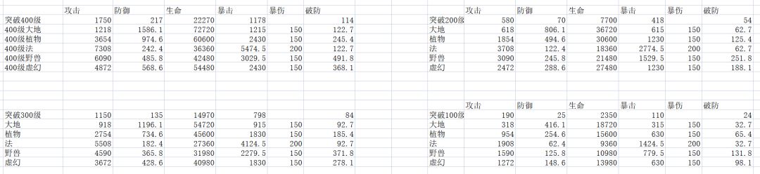 研究全职业属性一样,100级、200级、300级、400级突破属性对比
