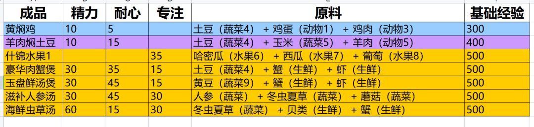 选择食物:不同品质的食物基础经验不同,并恢复一定的精力、耐力、专注,不同的食物恢复量不同,不过种地都垃圾(除了金色什锦水果1),有用的全需要探索材料。所以705前方法都都差不多。
