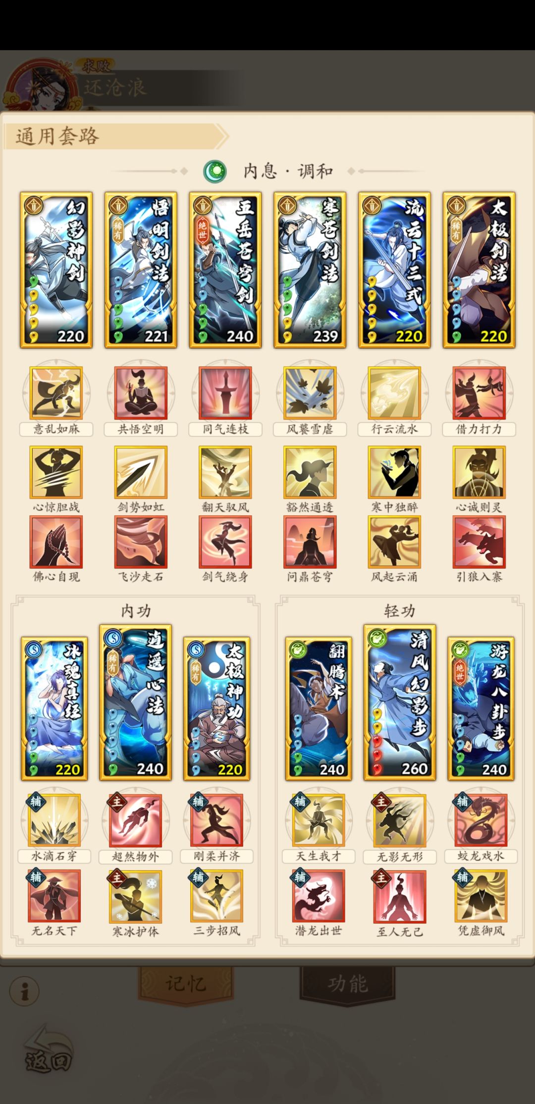 3.该套路最重要的是先手,所以轻功需要选择星最高的,如一般魅影最高可作为主运同时用潜龙升级,寒冰护体作为辅修。流云和悟明位置可换,换后可去除豁然招式。游龙星级不高可换先觉身法。如欲增加对吸内容错,在保证先手情况下可辅修飞鱼身法。