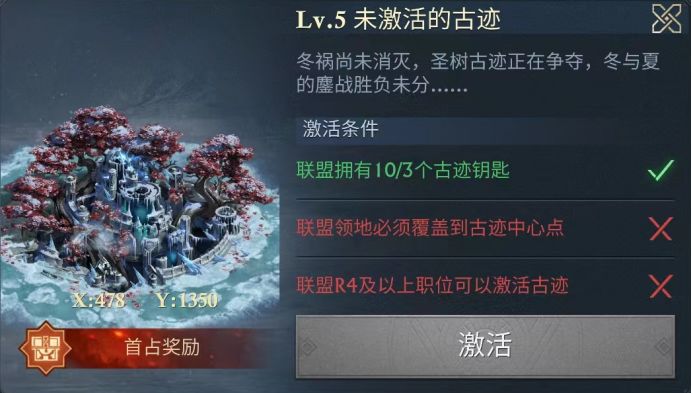 圣树古迹激活的前提条件是要拥有3把古迹钥匙,每净化一个冰侵联盟矿,就能获得一把古迹钥匙。与冰侵联盟矿一样,联盟领地必须覆盖到古迹的中心,联盟的R4/R5才能激活古迹。