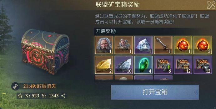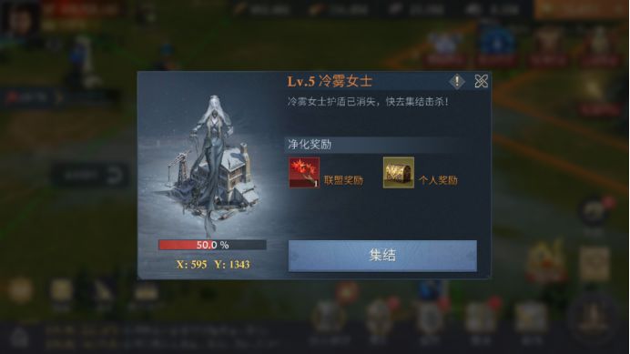 当冷雾女士的护盾值为零时,可通过集结的方式对冷雾女士发起攻击,击杀完成后获得古迹钥匙和联盟矿宝箱奖励,抽完宝箱里的礼物后,会生成和冷雾女士同等级的联盟矿,为联盟提供资源。