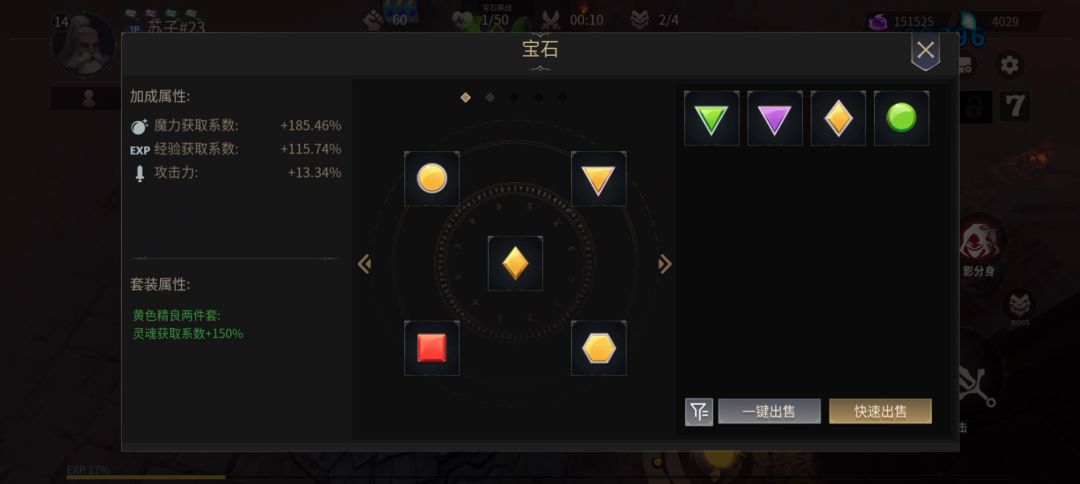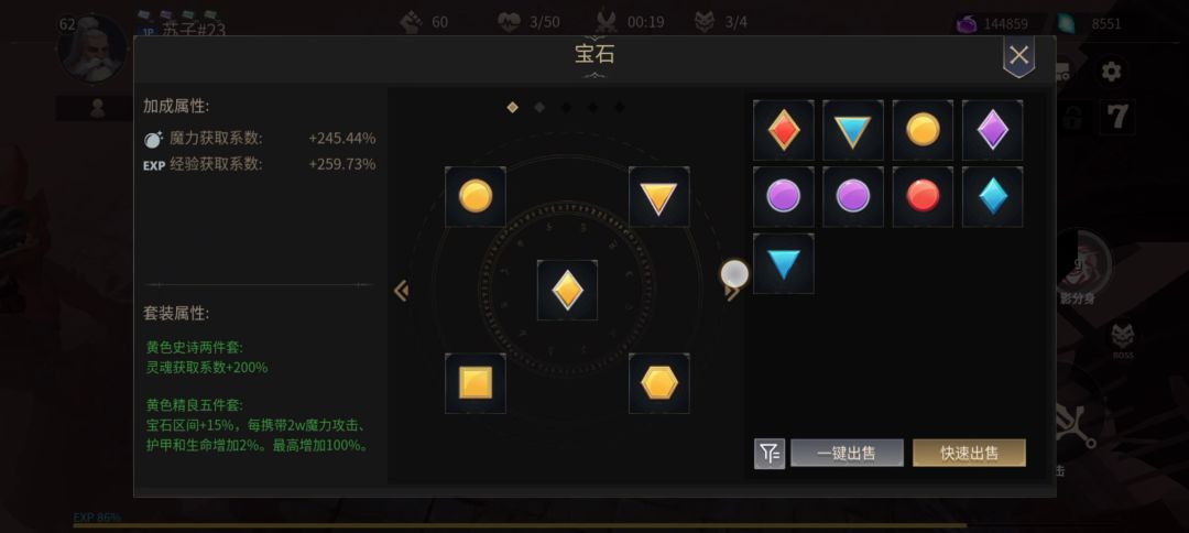打boss前优先黄宝石套装发育,打boss时切换成紫宝石套。这里会有朋友说,我看有人推荐左二红宝石,右二和中间紫宝石,为什么你全紫色呢? 这里小苏想说的是因为全紫宝石有概率刷新技能cd,哪有孩子天天哭,哪有赌狗天天输,下边视频中第三阶段boss小苏就触发了紫宝石套装效果,赌就完事了!