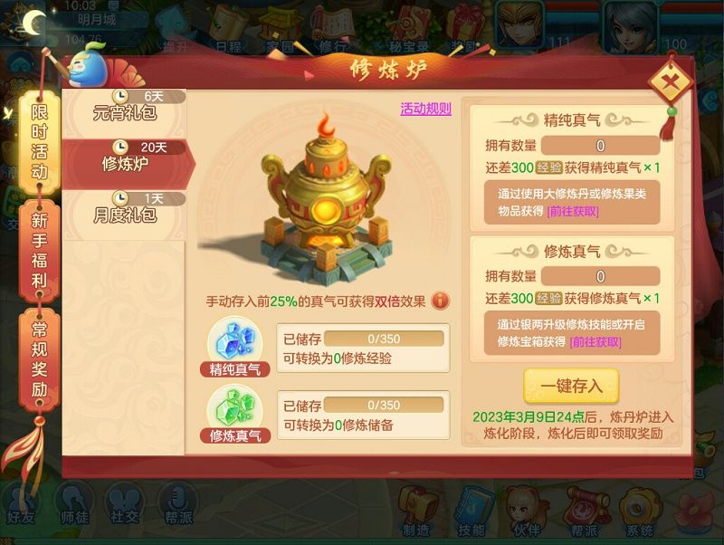 3)2023年3月10日-3月15日24:00,存入的修炼真气将进行炼化,每次完成炼化可以领取大修炼丹、修炼果以及修炼储备经验。