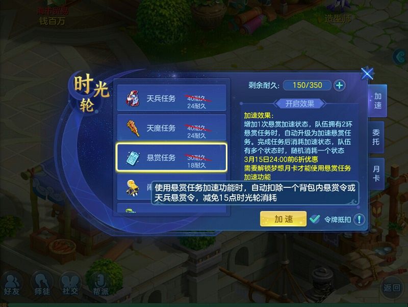 2)每日挑战加速:添加悬赏任务时光轮加速功能,开启需消耗20耐久,首月享6折折扣,需开启梦缘月卡才可使用。
