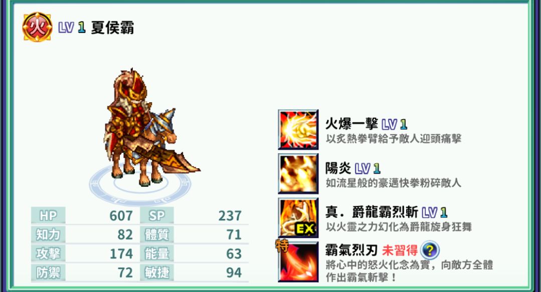 夏侯霸,作为神将,绝对不是浪得虚名的。就冲着夏侯霸的高攻击面板,火属性技能,就绝对是一个好打手。(平民阵容,夏侯霸绝对值得拥有一席之地)