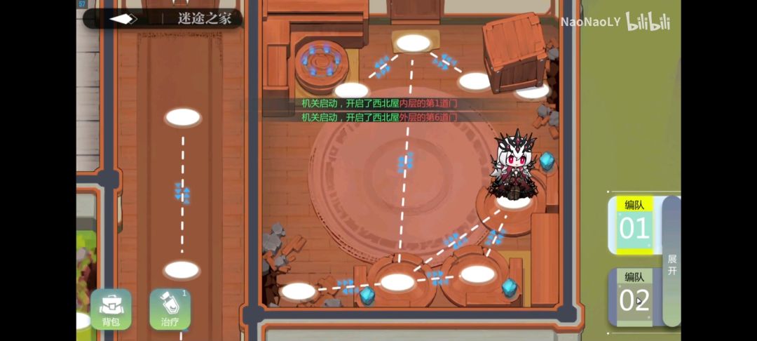 两队拿到水桶后,上面队伍到达屋子西北角,下面队伍来到机关处,需要开启中层4门和外层6门才能出去,萝卜不拿