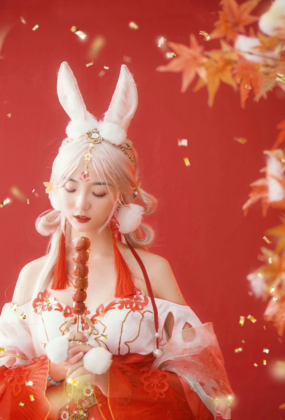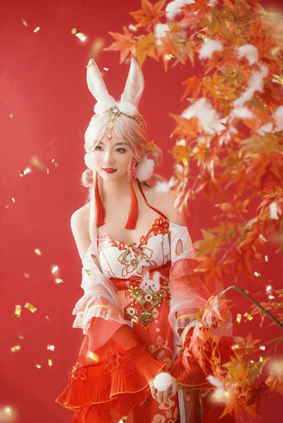 头顶兔耳,绒球浮动,灼灼红裙衣冠胜火,搭配上精致的玉兔妆容,浑身迸发着活泼灵动的氛围感。无论是夕阳下金色的麦田还是粉色的花丛,自带高光特效的兔子时装每一帧都是唯美大片。