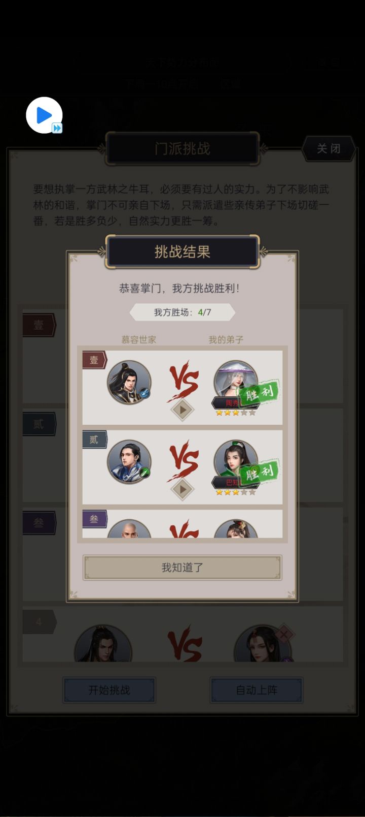 供参考:7打4胜即可。弟子最高的是18-9阶。刀、拳、剑拿了传承。