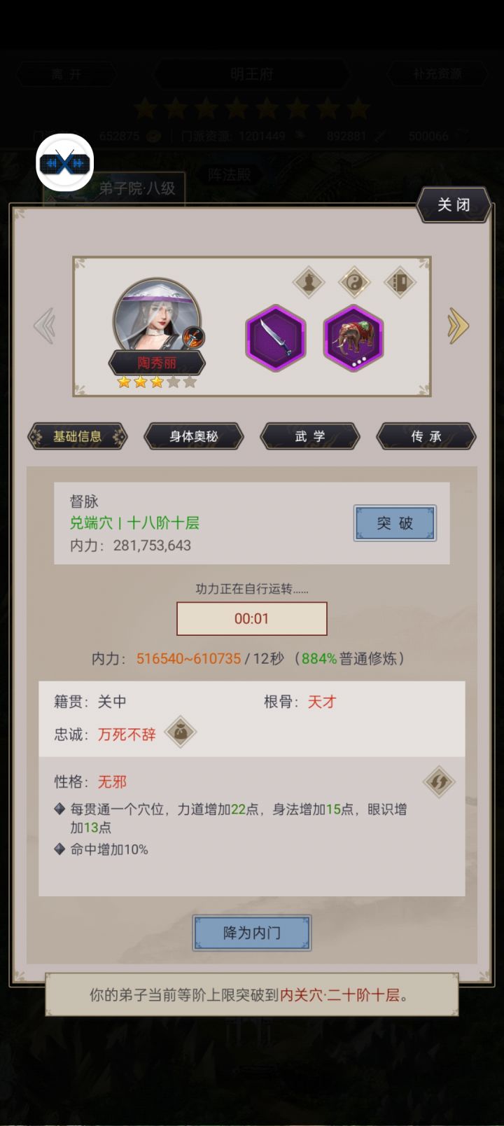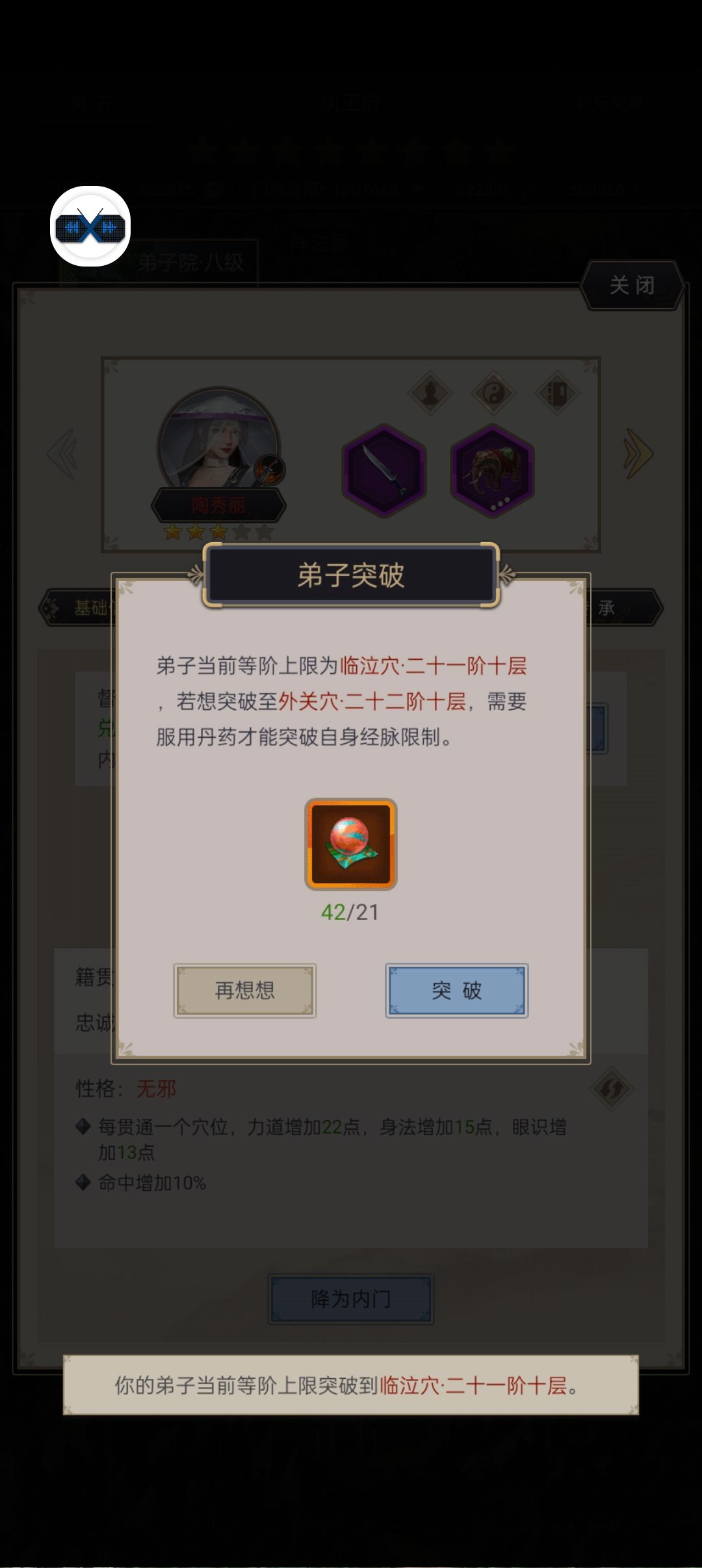 原来是这样的:等弟子等级到了18-10,就可以点突破,使用相应数量的九转合道丹,就能把上限分别突破到19-10,20-10,……26-10。如图。而九转合道丹的炼制,需要大量八卦还虚丹。选择命理丹术会爆丹。