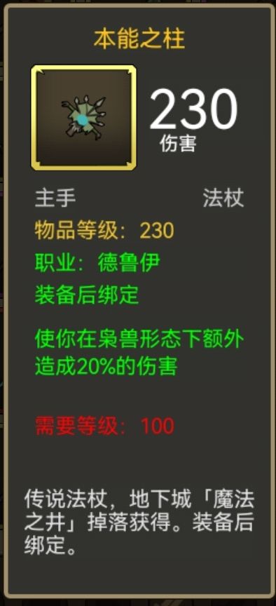 最后给大家推荐一把德鲁伊毕业神器,100级魔法之井掉落的本能之柱。