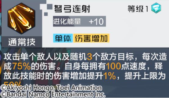 通常技:弩弓连射随机攻击4次的通常技,单次伤害较低,但可以重复攻击已攻击过的目标。根据自身的速度可以提升施放该技能时的伤害。