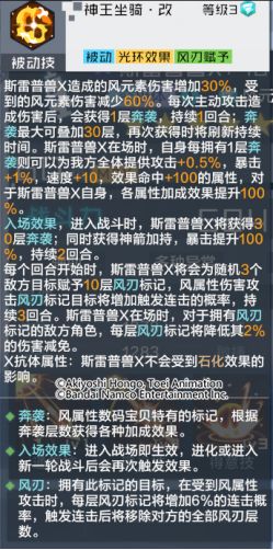 技能解析:自身拥有高额的风属性伤害增加与风属性伤害减免;自身在攻击时可以获取奔袭层数,并根据自身的奔袭层数为我方全体提供攻击、暴击、速度、效果命中等多种加成,而斯雷普兽X能够获得更高的属性加成。入场时,斯雷普兽X可以获得多层奔袭层数,并且将额外获得100%的暴击加成。每个回合开始时,斯雷普兽X为敌方数个目标赋予10层风刃,自身在场时,每层风刃将使敌方对应目标降低一定的伤害减免。X抗体属性使斯雷普兽X不会受到石化状态的影响。