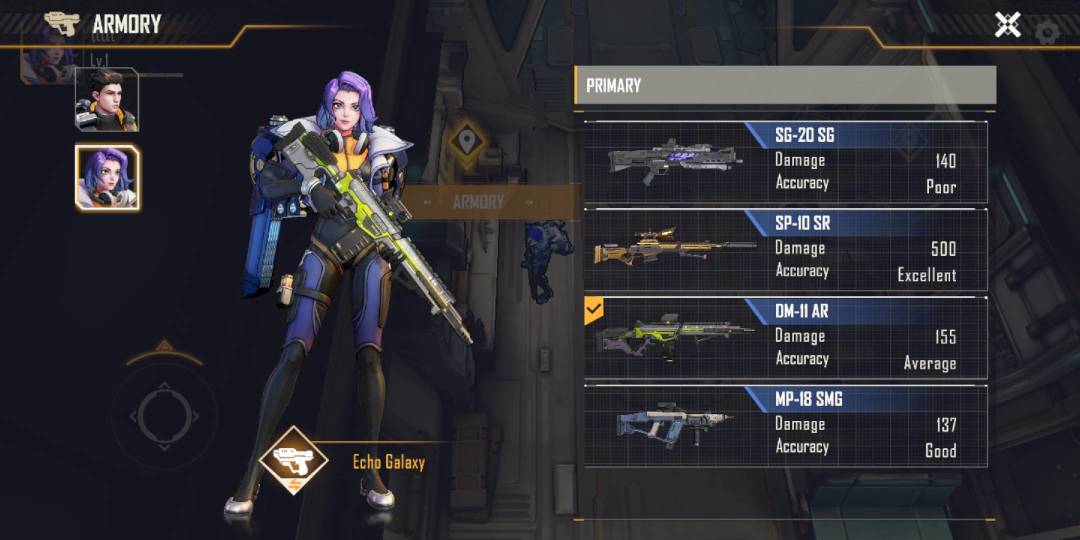玩家进入游戏后,利用手机左侧滑轮向左移动会发现 ARMORY(武器库) 按钮,点击它进入装备页面