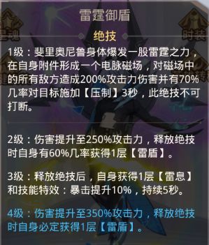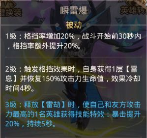 ◆雷电羁绊:免疫沉默效果;释放绝技时,使友方1名攻击最高的英雄获得1层【雷盾】;释放【雷劫】时恢复12%最大生命值。