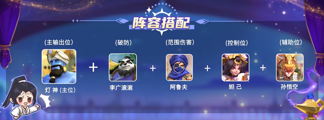 这套阵容比较适合前期过渡,灯神作为主力输出,再搭配阿鲁夫和李广滚滚,由李广滚滚对怪物破防增加阿鲁夫的AOE伤害,可以一定程度上防止大波怪物时,灯神无法及时处理,而控制角色则由妲己的魅惑进行,再由孙悟空进行快速铺场。