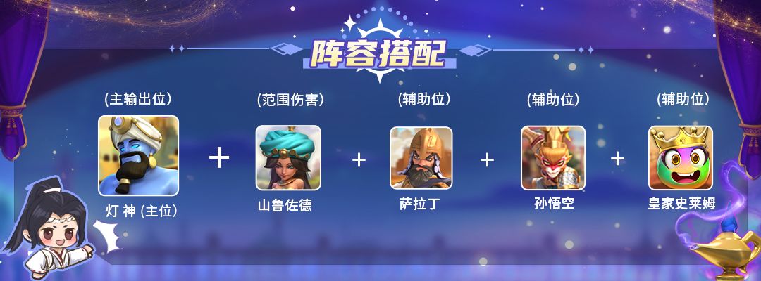 这套阵容则作为灯神的进阶阵容,最好是在有神器的情况下进行搭配,由萨拉丁提供必杀光环,再通过灯神的高攻速触发,虽然山鲁佐德的毒无法受到必杀光环的加持,但作为紫卡中比较优秀的AOE角色,还是可以进行伤害补充的,而孙悟空和皇家史莱姆都是为了快速铺场和提高角色星级。
