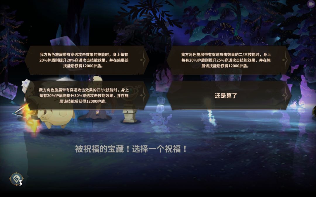 ①:我方角色施展穿透攻击时,身上每有20%护盾则提升10%技能效果。